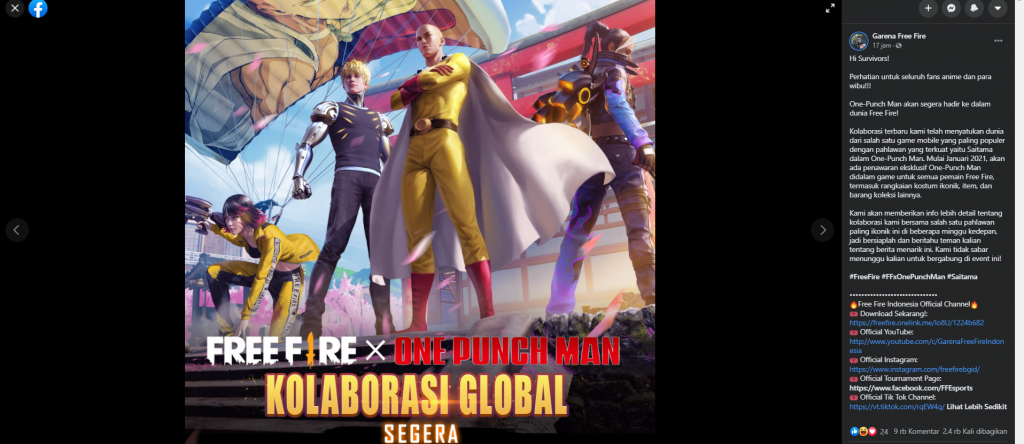 Kemarin, Free Fire baru saja mengumumkan kolaborasi mereka selanjutnya dengan menggandeng anime One Punch Man,Kolaborasi ini akan menyatukan game seluler terpopuler di dunia dengan salah satu superhero terkuat. Hal ini sekaligus memberikan akses kepada survivors (pemain) dari seluruh dunia untuk konten-konten in-game bertemakan “One-Punch Man” yang dapat dimainkan.