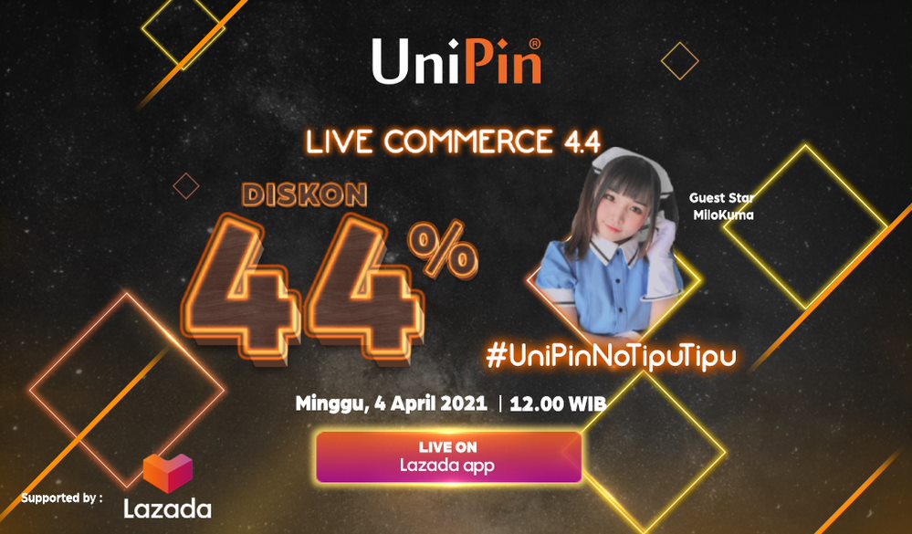 Acara streaming ini akan diselenggarakan pada hari Minggu, 4 April mendatang di situs atau aplikasi Lazada, LazLive.com. Dengan penawaran terbatas, acara ini akan berlangsung selama satu jam saja mulai dari 12.00 hingga 13.00 WIB. Selama live commerce, para gamers dapat menikmati penawaran khusus berupa diskon 44% untuk pembelian UniPin Voucher dan Steam Wallet. Selain promo spesial, Lazada beserta UniPin juga telah mempersiapkan acara up close & personal bersama influencer gamer, Milokuma. Sehingga, para gamer dapat berinteraksi dan berbagi tanya jawab dengan Milokuma sambil berbelanja produk UniPin.